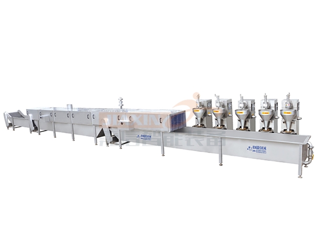 成型后的肉丸需在蒸煮槽的进一步蒸煮后通过旋转的拨板匀速地移动到蒸煮槽末端。不同品种肉丸蒸煮所需时间可通过调节拨板的转速来控制。通过链条传动到冷却槽内的肉丸须在冷却槽内迅速冷却,冷却槽内的水为开放型的,即进入冷水而溢出热水已达到冷却槽内水温始终在20度-25度左右。肉丸在冷却槽内冷却后可直接进入速冻车间挂冰冷冻。
